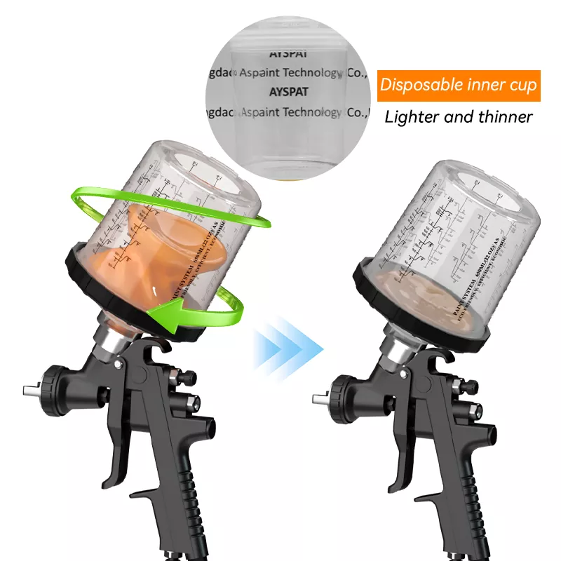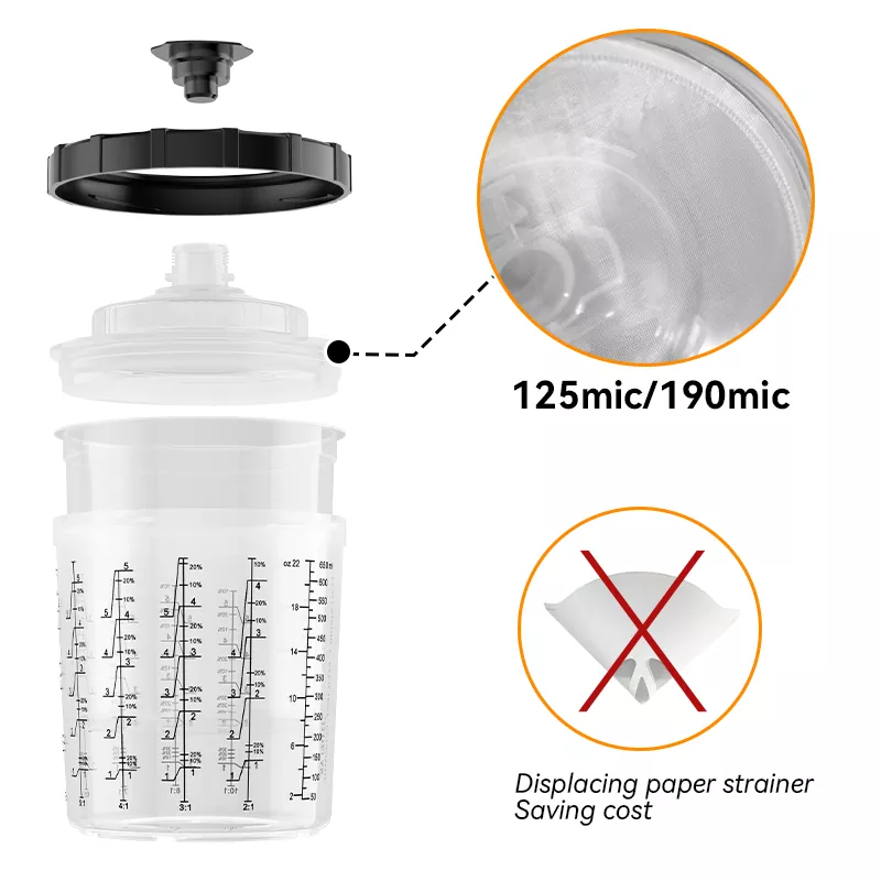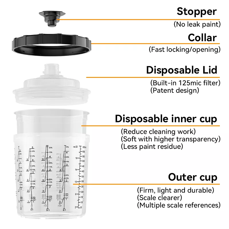 راسیستم فنجان رنگ یکبار مصرف 2.0 از مواد PP سازگار با محیط زیست ساخته شده است که هم انعطاف پذیر و هم بادوام است. این می تواند به طور مستقیم جایگزین فنجان های قابل استفاده مجدد سنتی شود، فرآیند تمیز کردن چند دقیقه ای را با هر بار تعویض رنگ حذف می کند و مصرف حلال را به میزان قابل توجهی 20-30٪ کاهش می دهد. طراحی کاملا محصور شده همراه با فیلتراسیون دقیق، آلاینده های خارجی را کاملاً جدا می کند و کیفیت اسپری ثابت و پایدار را در هر بار تضمین می کند و به طور موثر از مشکلات تفاوت رنگ جلوگیری می کند. ویژگی تغییر سریع لیوان تفنگ اسپری مخصوصاً برای عملیات اسپری چند رنگ مناسب است، زمان تغییر رنگ را تا 50٪ کاهش می دهد و راندمان تولید را به طور قابل توجهی بهبود می بخشد.