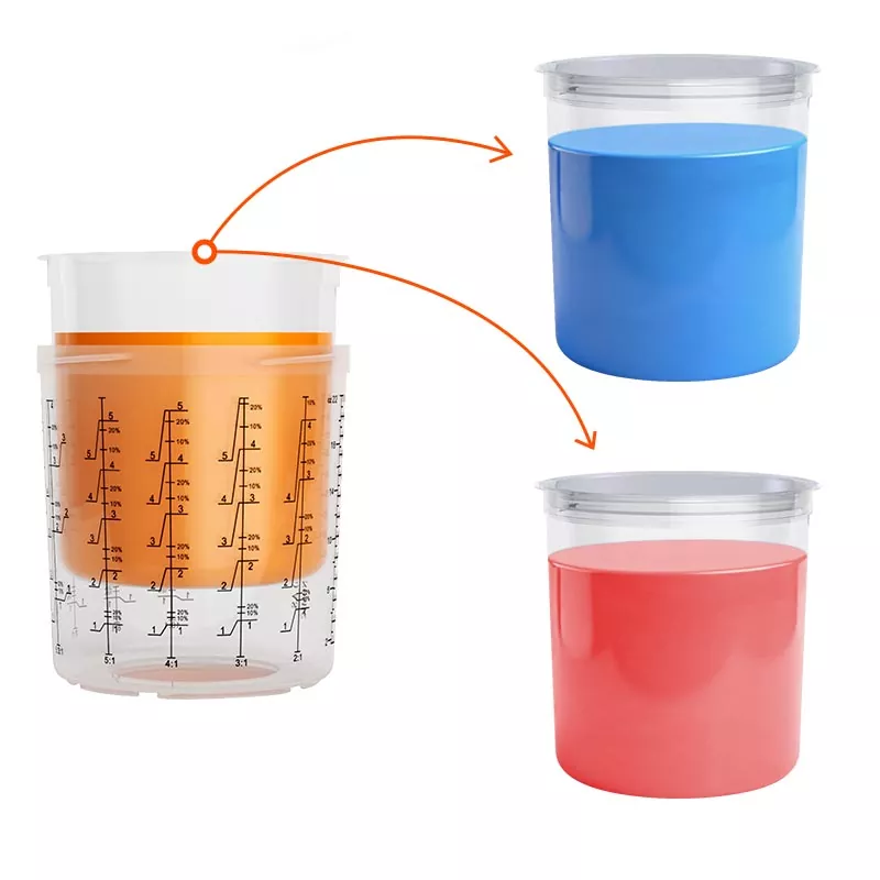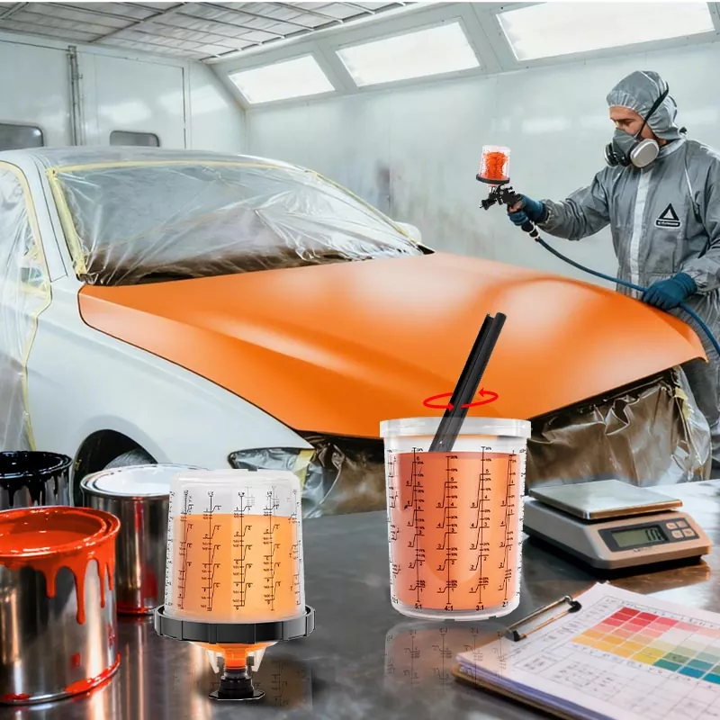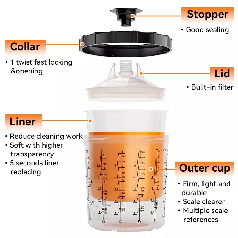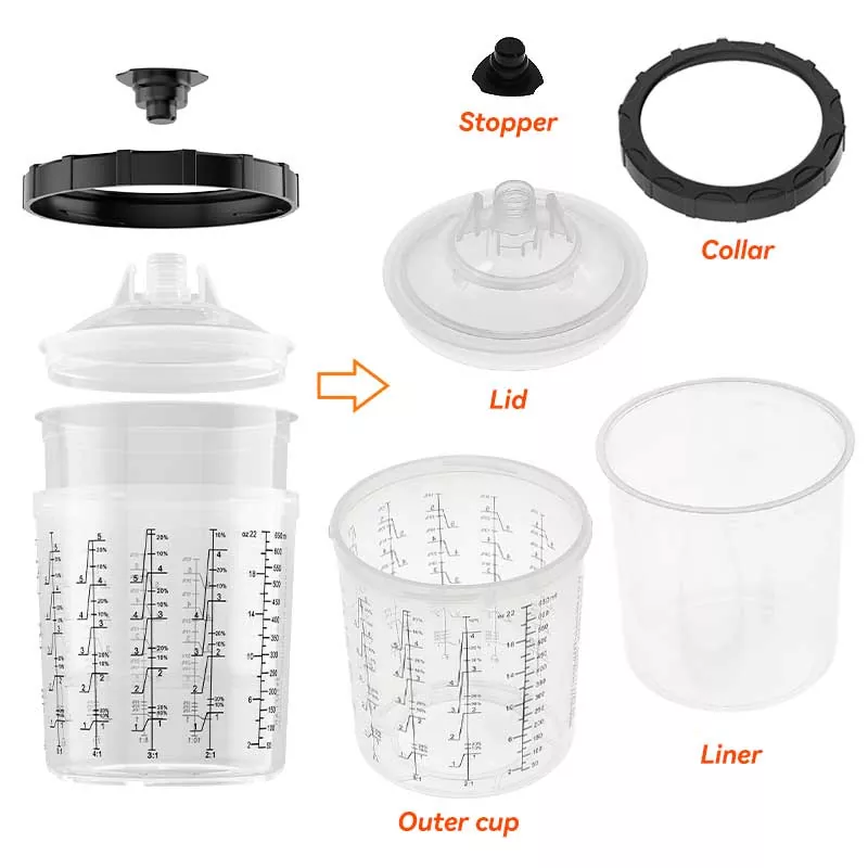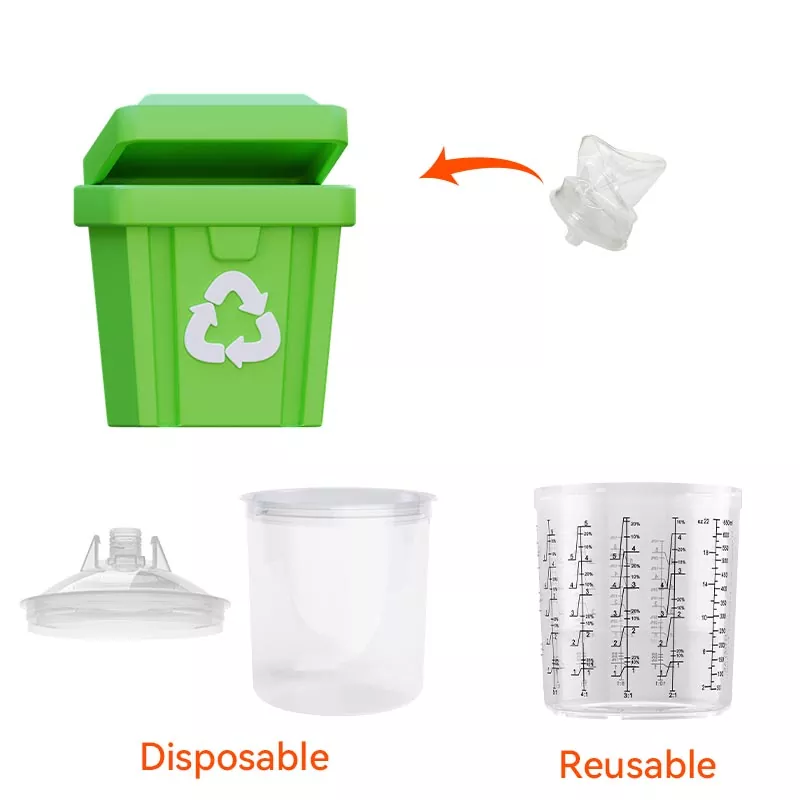 سیستم فنجان رنگ یکبار مصرف عملکردهای مخلوط کردن، فیلتر کردن، پاشش و ذخیره سازی را در یک واحد ترکیب می کند. این نه تنها آماده سازی پیش رنگ را ساده می کند، بلکه در هزینه اختلاط فنجان ها و قیف های کاغذی نیز صرفه جویی می کند و آنها را به گزینه ای عالی برای صرفه جویی در زمان آماده سازی و بهبود راندمان پاشش تبدیل می کند.