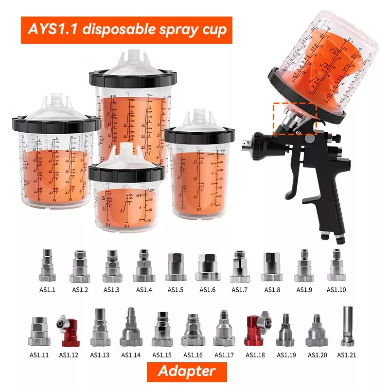 فنجان اسپری یکبار مصرف AYS1.1 با آداپتور سری PPS1.0 سازگار است. با آداپتور می توان آن را کاملاً با هر مارکی از تفنگ اسپری تطبیق داد و در هر موقعیتی بدون خطر چکیدن رنگ قابل استفاده است.