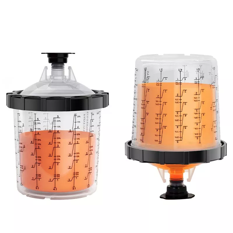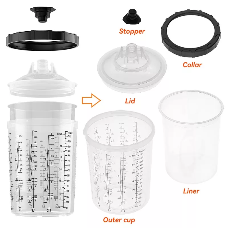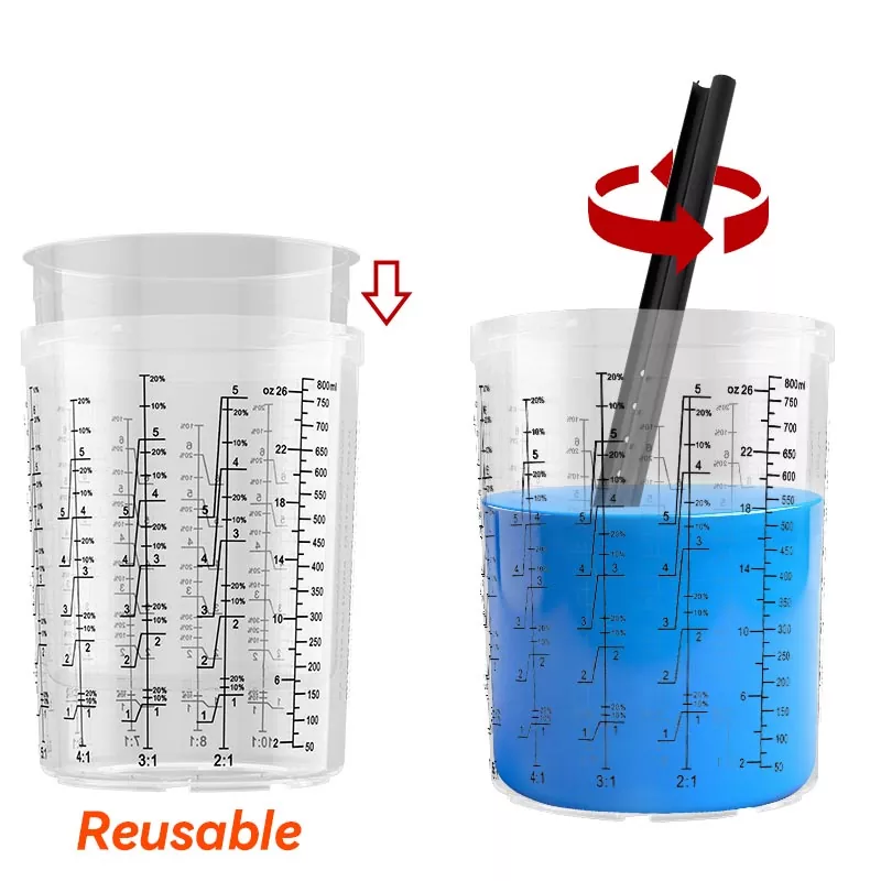 لیوان بیرونی قابل استفاده مجدد با مقیاس نسبت اختلاط. آستر یکبار مصرف را در فنجان بیرونی قرار دهید و رنگ را مستقیماً در آستر مخلوط کنید. با استفاده نکردن از فنجان مخلوط سنتی هزینه مواد را کاهش دهید.